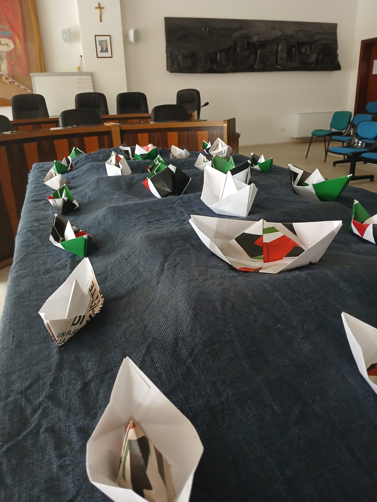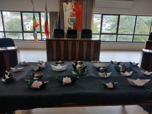 Nella Sala del Consiglio, in Municipio a Castelnovo, è stata allestita una piccola, semplice ma significativa installazione, composta da una flotta di barchette di carta su un mare di tessuto blu, su un tavolo al centro dello spazio più importante della vita pubblica del paese.