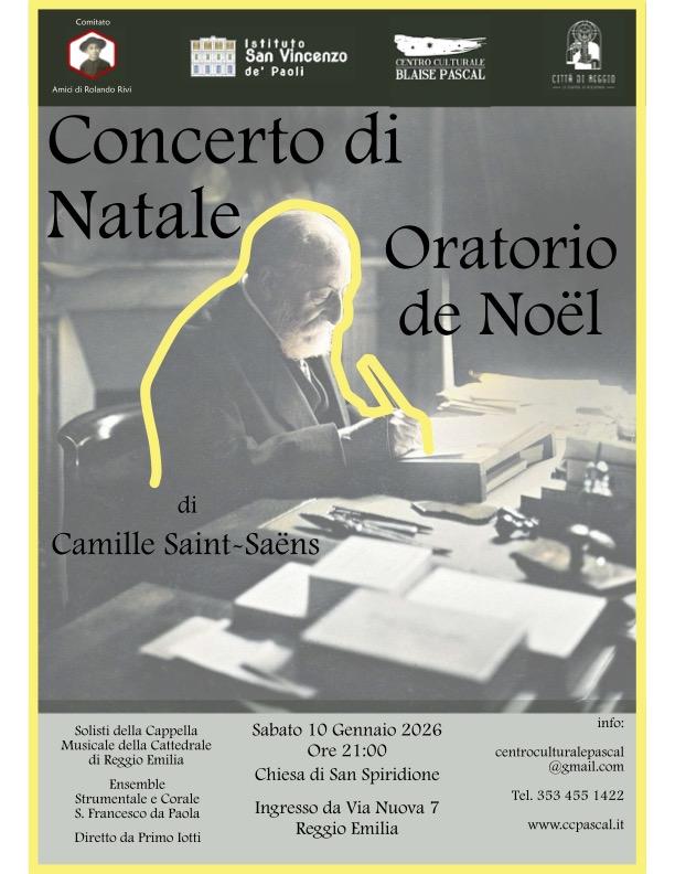 Il prossimo 10 gennaio 2026, a chiusura del tempo di Natale, il Centro Culturale Blaise Pascal, in collaborazione con il Comitato Amici di Rolando Rivi, l’Associazione Città di Reggio e l’Istituto San Vincenzo de’ Paoli, propone una serata di ascolto di musica sacra. L’opera proposta sarà L’Oratorio de Noël, per soli, coro e orchestra composto nel 1860 da Camille Saint-Saëns, autore molto stimato nella seconda metà dell’800 per le sue considerevoli doti di compositore e organista, attivo presso la chiesa de La Madeleine di Parigi. Il concerto sarà ad entrata libera.