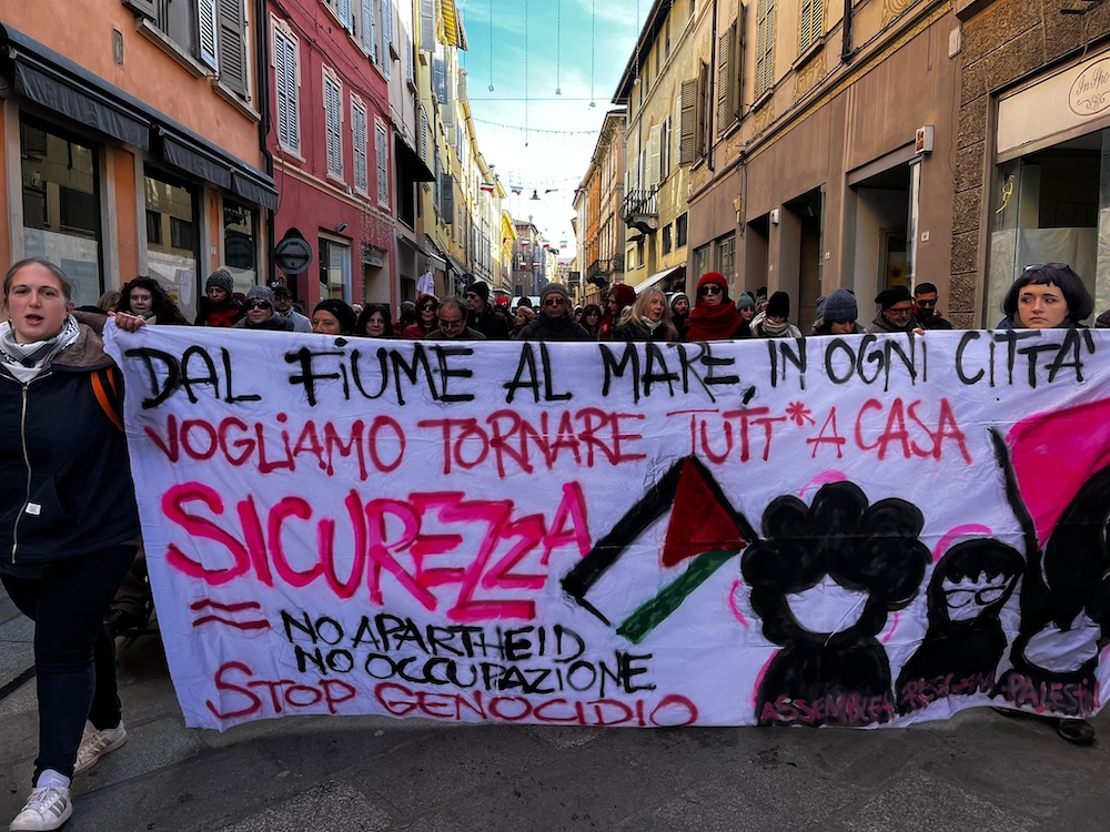 “Oggi abbiamo deciso di essere in piazza, nella camminata chiamata dalla città contro la violenza sulle donne. Abbiamo deciso di attraversarla come soggettività decoloniale, perché non ci sembrava possibile non essere in piazza nella nostra città contro la violenza di genere nella giornata globale di solidarietà con la Palestina.