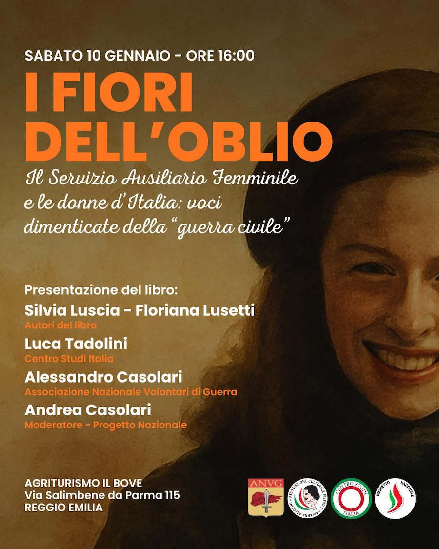 Centro Studi Italia, Progetto Nazionale, Associazione Nazionale Volontari di Guerra -Federazione di Reggio Emilia (ANVG) e Associazione Culturale Pietro e Marianna Azzolini annunciano per Sabato 10 Gennaio ore 16.00 presso Agriturismo Il Bove a Villa Sesso di Reggio Emilia, Via Salimbene da Parma 115, la presentazione del libro “I fiori dell’oblio. Il Servizio Ausiliario Femminile e le donne d’Italia: voci dimenticate della guerra civile“.