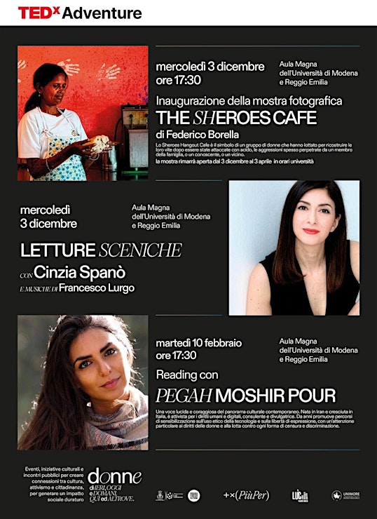Mercoledì 3 dicembre,alle 17.30 nell’Aula Magna di Unimore (viale Allegri), è in programma l’inaugurazione della mostra fotografica ‘The sheroes Cafe’di Federico Borella – promossa dal Comune di Reggio Emilia in collaborazione con l’Associazione PiùPer Reggio Emilia all’interno del progetto “Donne di ieri, oggi e domani, qui ed altrove” – per raccontare storie di donne di ordinaria straordinarietà. La mostra racconta, in particolare, la storia dello Sheroes Hangout Cafe, fondato da un gruppo di donne indiane che hanno lottato per ricostruire le loro vite dopo essere state attaccate con l’acido. A seguire sono in programma alcune letture sceniche a cura di Cinzia Spanò, con musiche di Francesco Lurgo.
